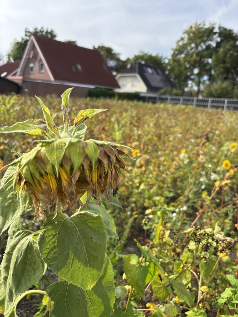 Blühflächen wie diese sind besonders wertvoll, denn sie bieten Nahrung und Unterschlupf für zahlreiche Insektenarten. Leider geht der Bestand vieler bestäubender Insekten – darunter Bienen, Hummeln und Schmetterlinge – seit Jahren stark zurück. Dieses Insektensterben hat weitreichende Folgen für unser gesamtes Ökosystem, denn ohne Bestäuber geraten auch viele Pflanzenarten und damit ganze Nahrungsketten aus dem Gleichgewicht.